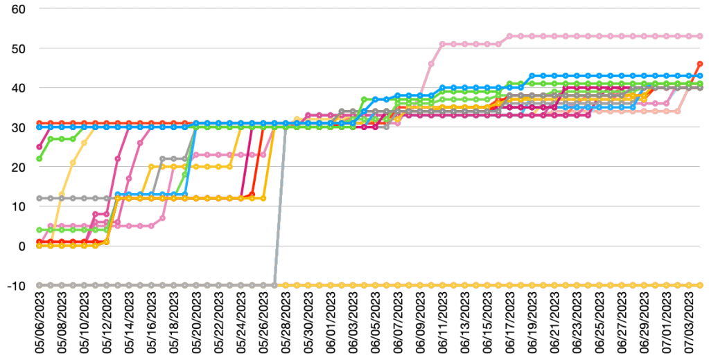 I did a bit more interleaving of jobs going from 30 – 40. I think it might be better for me to focus on getting a job to the next limit to get more quality time with that job.