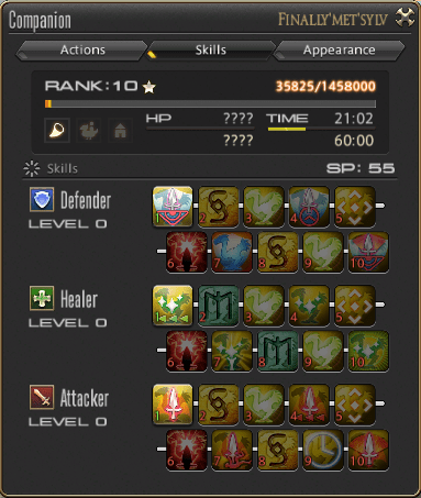 As you gain experience and level, you obtain “Skill Points” (SP). You can then use those skill points to increase the skill level of your chocobo. You can see that Rauwrer has been a bit remiss in doing this. He has 55 skill points that he hasn’t allocated: